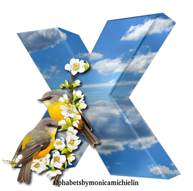 BLUE SKY ALPHABET WITH TWO BIRDS AND ICONS PNG